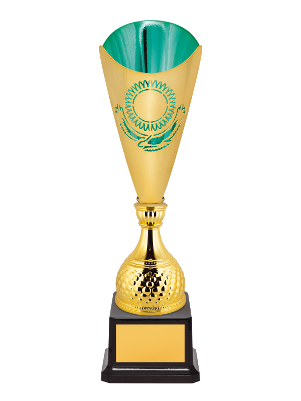 Кубок с металлической чашей с символикой Республики Казахстан на пластиковом основании.